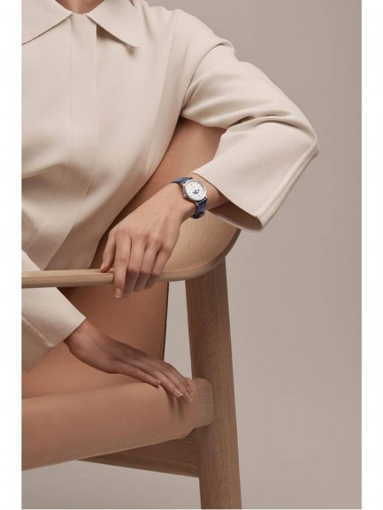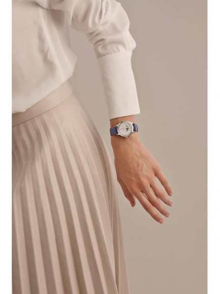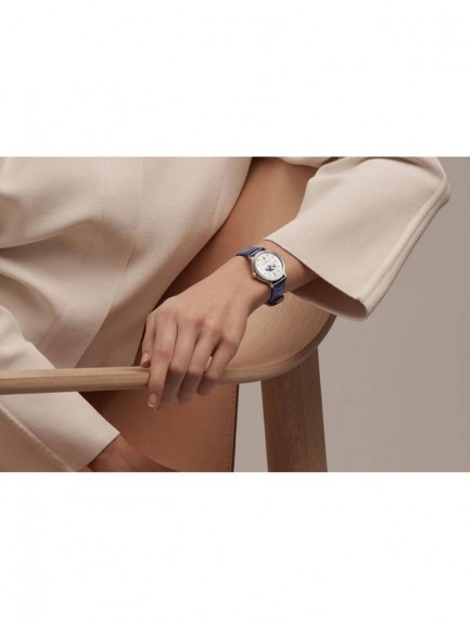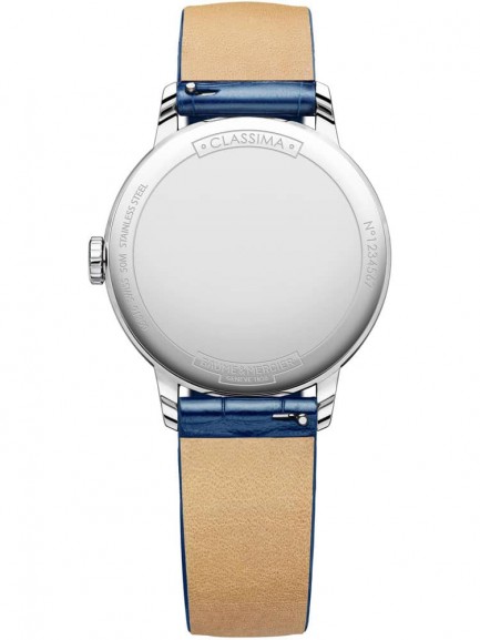 The Baume & Mercier 10329 Classima watch combines a 31mm round shaped stainless steel case and glossy blue alligator leather strap with a buckle clasp. It has a silver sun satin-finished dial with 8 diamond hour markers totalling 0.03ct, a moonphase indicator, and a date display, all of which is protected beneath scratch resistant sapphire crystal glass. Power is generated by the Swiss made Ronda 788 quartz movement. This model also has a water resistance of up to 50 metres.
