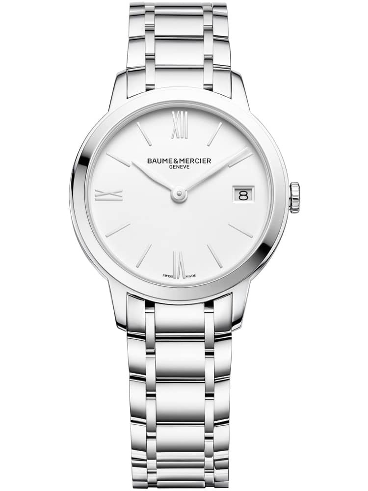The Baume & Mercier 10335 Classima watch combines a 31mm round shaped stainless steel case and bracelet with a triple folding push button clasp. It has a silver analogue dial with a date display which is protected beneath scratch resistant sapphire crystal glass. Power is generated by the Swiss made Ronda 704 quartz movement. This model also has a water resistance of up to 50 metres.