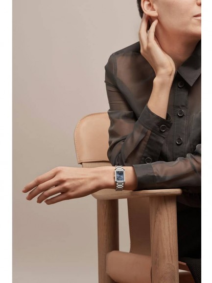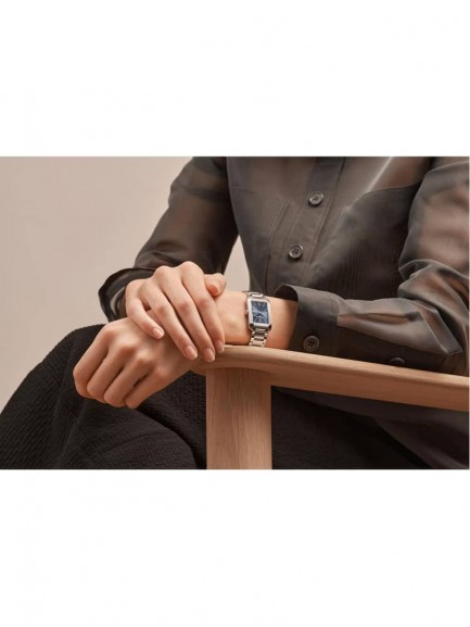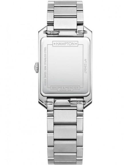 The Baume & Mercier 10476 Hampton watch combines a rectangular shaped stainless steel case and bracelet with a fold over clasp. The case measures 22mm wide by 35mm long. It has a blue analogue dial with silver tone hands and hour markers, all of which is protected beneath curved scratch resistant sapphire crystal glass. Power is generated by the Swiss made MHH057 quartz movement. This model also has a water resistance of up to 50 metres.