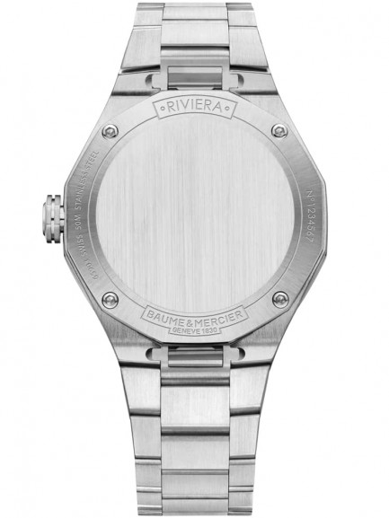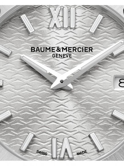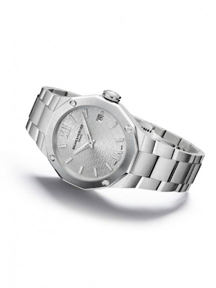 The Baume & Mercier 10614 Riviera watch combines a 36mm round shaped stainless steel case and dodecagonal bezel with a bracelet and fold over clasp. It has a silver patterned analogue dial with luminescent hands and a date display which is protected beneath scratch resistant sapphire crystal glass with an anti-glare coating. Power is generated by the Swiss made Ronda 714Li quartz movement. This model also has a water resistance of up to 50 metres and 4 diamonds totalling 0.11ct set into the corners of the bezel.