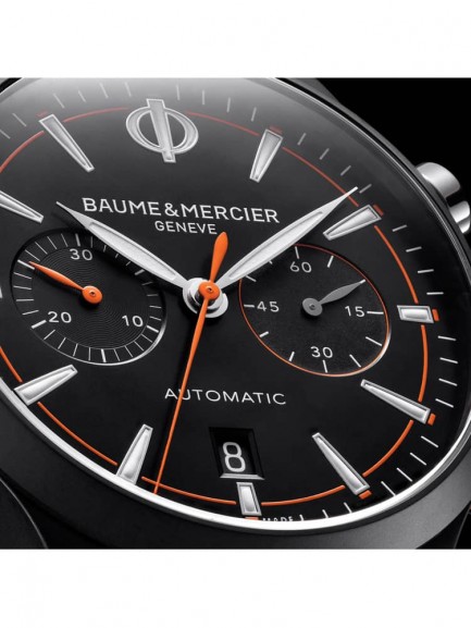 The Baume & Mercier 10452 Capeland watch has a 42mm round shaped sand blasted stainless steel case with a black ADLC coating and a black leather strap with an orange rubberised lining and push button clasp. It has a black analogue dial with a date display, chronograph sub-dials and Superluminova coated hands, all of which is protected beneath domed scratch resistant sapphire crystal glass with an anti-glare coating applied on one side. Power is generated by the Swiss made ETA 2894-2 automatic movement with 37 rubies and a power reserve of 42 hours. This model also has a water resistance of up to 50 metres.
