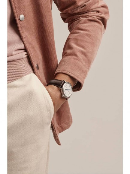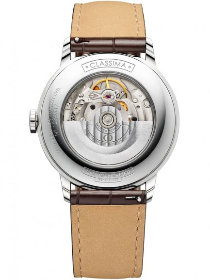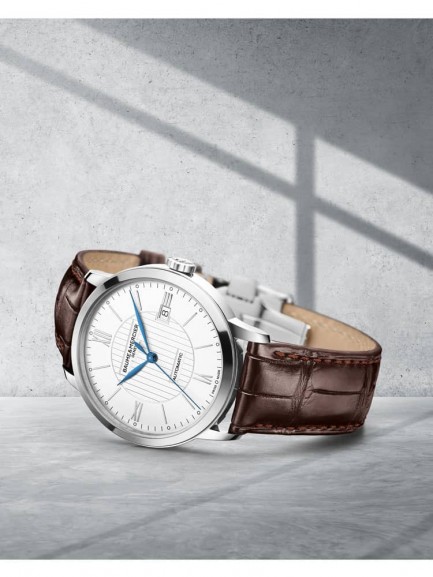 The Baume & Mercier 10214 Classima watch combines a 40mm round shaped stainless steel case and brown leather strap with a triple folding clasp and push button. It has a silver analogue dial with blue hands and a date display which is protected beneath scratch resistant sapphire crystal glass. Power is generated by the Swiss made Sellita SW200 automatic movement with 26 Rubies and a 38 hour power reserve. This model also has a sapphire crystal case back and a water resistance of up to 50 metres.