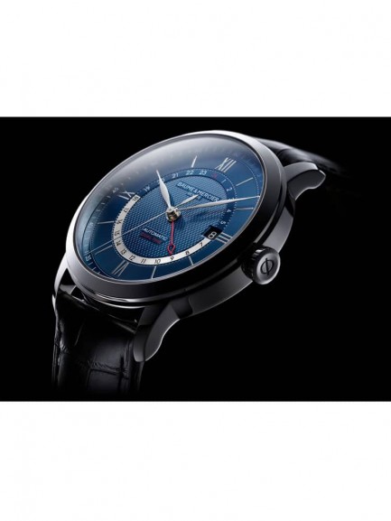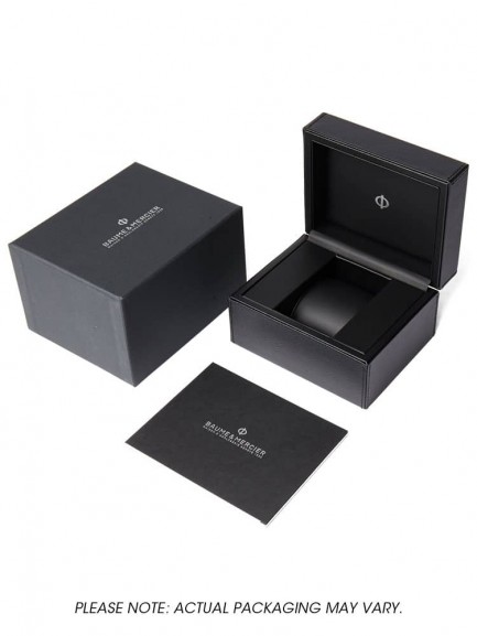 The Baume & Mercier 10482 Classima watch combines a 42mm round shaped stainless steel case and black leather strap with a triple folding clasp and push button. It has a blue analogue dial with a date display and a red pointer indicating a 2nd time zone, all of which is protected beneath scratch resistant sapphire crystal glass. Power is generated by the Swiss made ETA 2893-2 automatic movement with 21 rubies and a power reserve of up to 42 hours. This model also has a sapphire crystal case back and water resistance of up to 50 metres.
