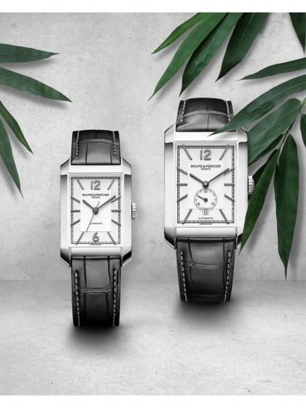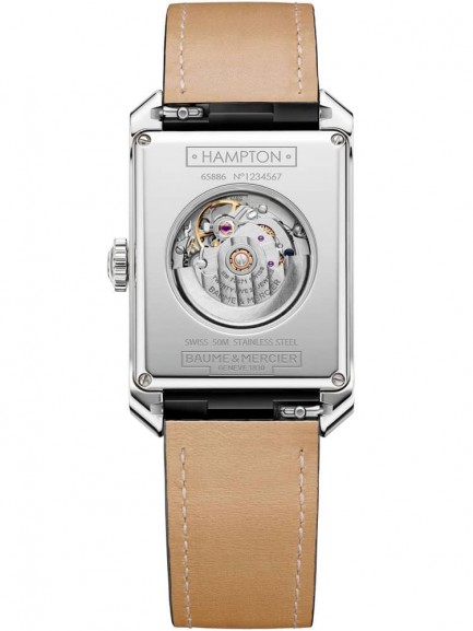 The Baume & Mercier 10522 Hampton watch combines a rectangular shaped stainless steel case and black leather strap with a triple folding clasp and push button. The case measures 27.5mm wide by 43mm long. It has a silver analogue dial which is protected beneath scratch resistant sapphire crystal glass. Power is generated by the Swiss made ETA 2671 automatic movement with 21 jewels and a power reserve of up to 38 hours. This model also has a sapphire crystal case back and a water resistance of up to 50 metres.