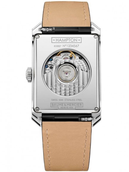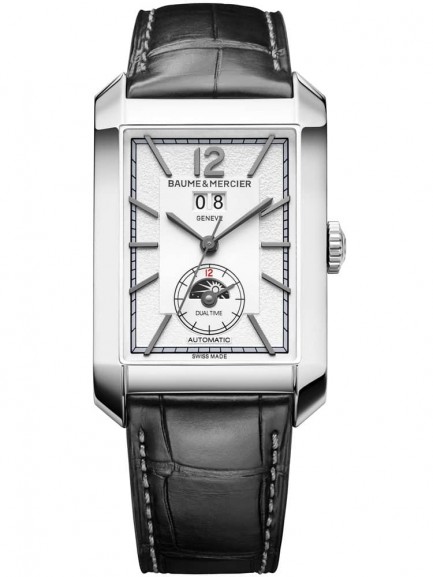 The Baume & Mercier 10523 Hampton watch combines a rectangular shaped stainless steel case and black leather strap with a triple folding clasp and push button. The case measures 31mm wide by 48mm long. It has a silver analogue dial with a date display and dual time sub-dial which is protected beneath scratch resistant sapphire crystal glass. Power is generated by the Swiss made Soprod TT651 automatic movement with 21 rubies and a power reserve of up to 42 hours. This model also has a sapphire crystal case back and a water resistance of up to 50 metres.