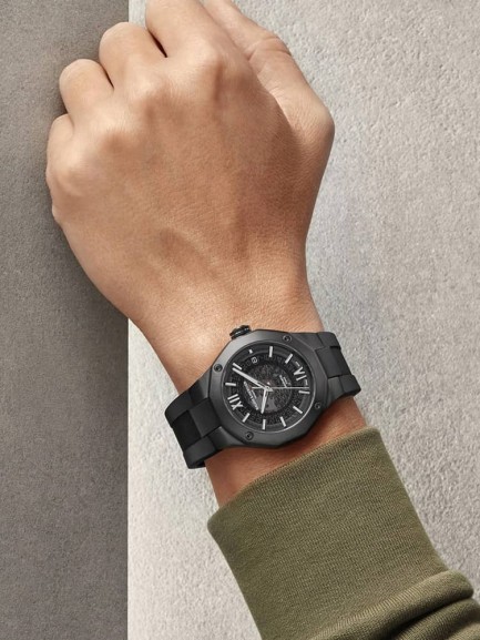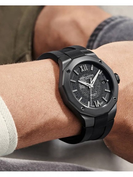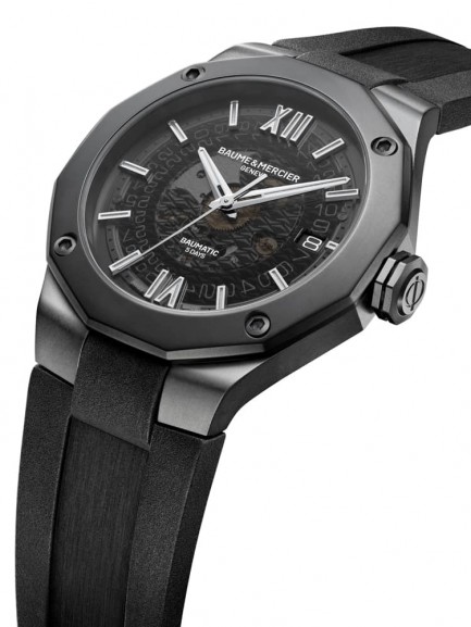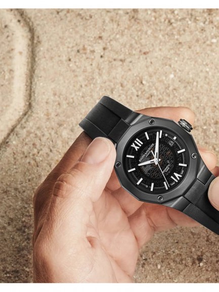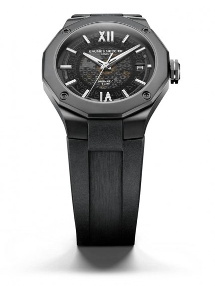 The Baume & Mercier 10617 Riviera watch combines a 42mm round shaped black stainless steel case and dodecagonal bezel with a black rubber strap and push button clasp. It has a skeleton analogue dial with luminescent hands and a date display which is protected beneath scratch resistant sapphire crystal glass with an anti-glare coating. Power is generated by the Swiss made Baumatic BM13-1975A COSC certified automatic chronometer movement with 21 rubies and a power reserve of up to 120 hours. This model also has a sapphire crystal case back and a water resistance of up to 100 metres.
