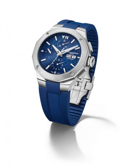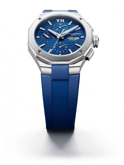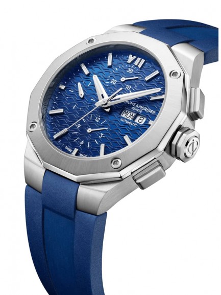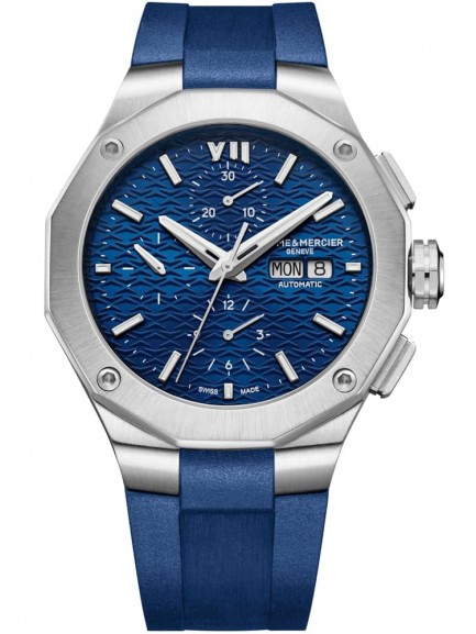 The Baume & Mercier 10623 Riviera watch combines a 43mm round shaped stainless steel case and dodecagonal bezel with a blue rubber strap and push button clasp. It has a blue analogue dial with luminescent hands, a day/date display, and chronograph sub-dials, all of which is protected beneath scratch resistant sapphire crystal glass. Power is generated by the Swiss made Valjoux 7750 automatic movement with 25 rubies and a power reserve of up to 48 hours. This model also has a sapphire crystal case back and a water resistance of up to 100 metres.