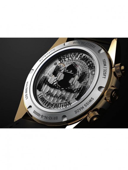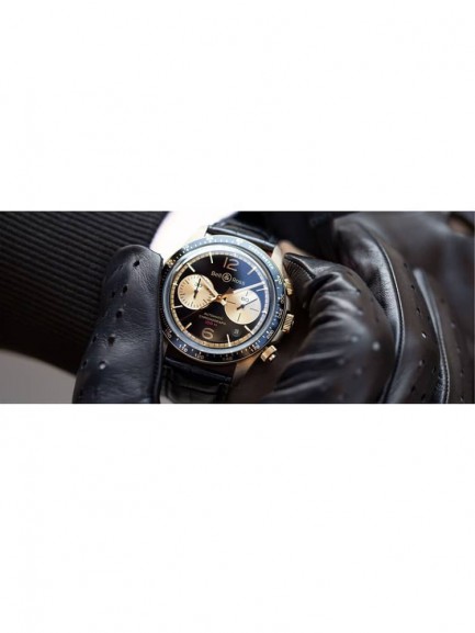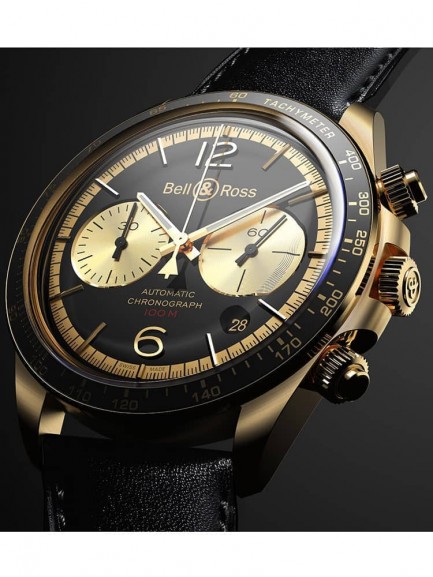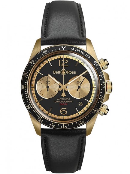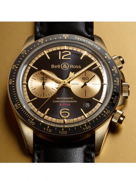 This limited edition Bell & Ross watch from the BR V Chrono collection is limited to just 999 pieces worldwide. The watch has a round bronze and steel case with a black calfskin leather strap and folding push button clasp. Ultra curved anti-reflective coated sapphire crystal protects the dial, which is composed of a black backdrop with Superluminova coated gold hands and indexes, a date display, and chronograph sub-dials. Powering the watch is a calibre BR-CAL.301 automatic mechanical movement.