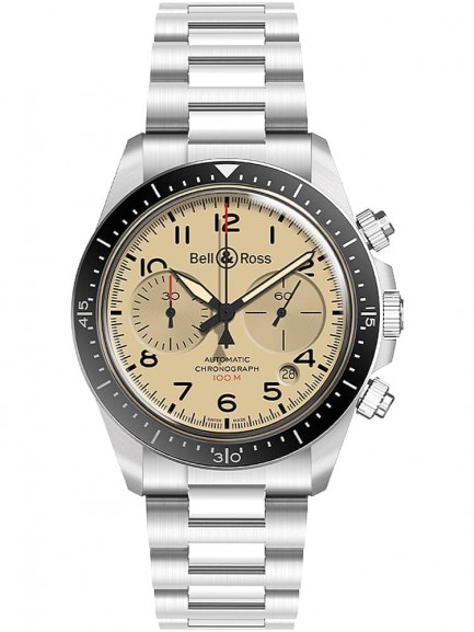 Bell & Ross introduce this watch from the BR V Chrono collection with a satin polished stainless steel case and bracelet with folding clasp. Ultra curved anti-reflective coated sapphire crystal protects the dial, which is composed of a beige backdrop with Superluminova coated black hands and Arabic numerals, as well as a date display and chronograph sub-dials. Powering the watch is a calibre BR-CAL.301 automatic mechanical movement.