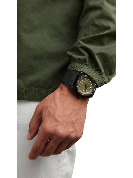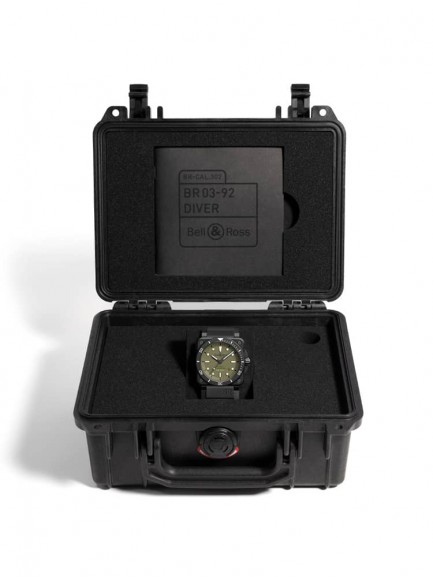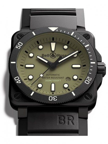 The Bell & Ross BR0392-D-KA-CE/SRB BR 03 watch is limited to just 999 pieces and combines a 42mm square shaped ceramic case and black rubber strap with a traditional buckle. It has an olive green analogue dial with luminescent hands and a date display which is protected beneath sapphire crystal glass with an anti-reflective coating. Power is generated by the Calibre BR-CAL.302 automatic movement with a 40 hour power reserve. This model also has a water resistance of up to 300 metres and comes with an extra khaki coloured ultra-resilient synthetic fabric strap.