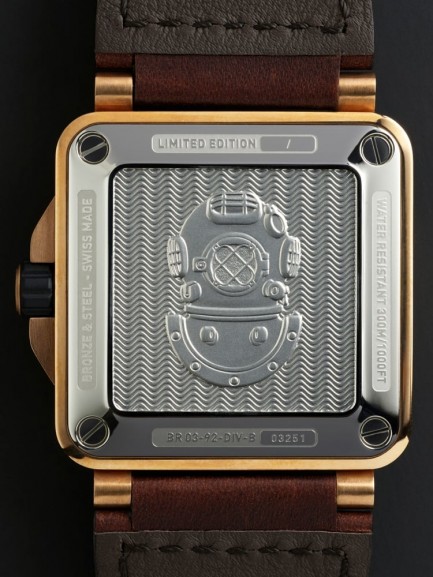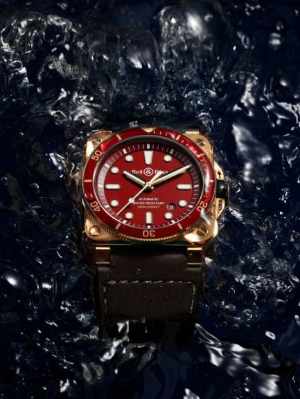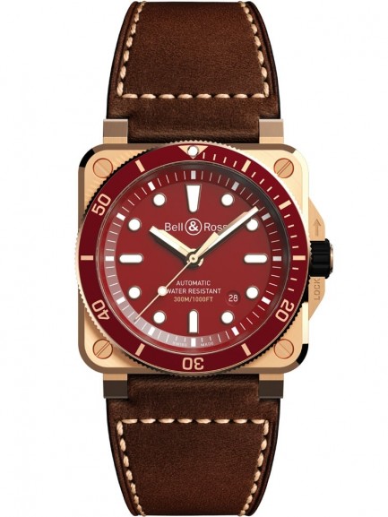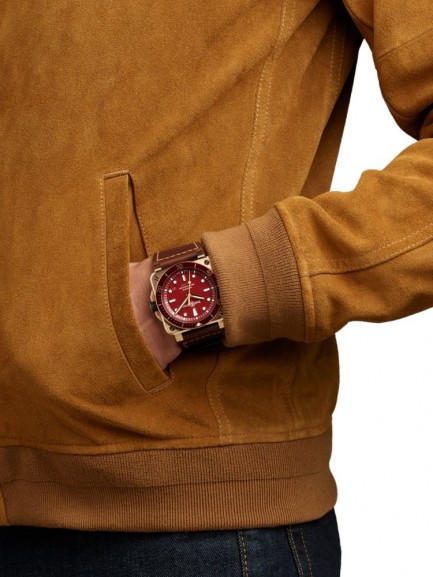 A limited Edition of 999, the Bell & Ross BR0392-D-R-BR/SCA watch combines a 42mm square shaped CuSn8 bronze case and a brown coloured calfskin leather strap with a traditional buckle fastening. It has a red analogue dial with gold plated Super-LumiNova filled hands and hour markers and a date window between four and five o-clock. The dial is protected beneath sapphire crystal glass with an anti-reflective coating. Power is generated by the automatic movement. This model also comes with a woven black rubber strap with a traditional buckle fastening and has a water resistance of up to 300 metres.