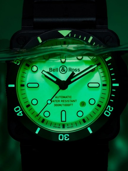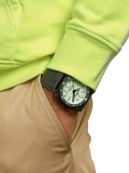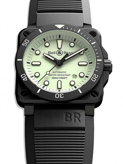 The Bell & Ross BR0392-RRDE-CE/SRB Diver Lum watch combines a 42mm square shaped matte black ceramic case and black woven black rubber and ultra-resilient black synthetic fabric with a traditional buckle with a black PVD coated steel pin. It has a luminescent green analogue dial painted with Super-LumiNova with metal applique skeleton Super-LumiNova-filled numerals and indices which are protected beneath sapphire crystal glass with anti-reflective coating. Power is generated by a calibre BR-CAL.302 automatic mechanical movement and features an unidirectional rotating ceramic bezel with 60-minute scale and date window at the 4:30 position. This model also has a water resistance of up to 300 metres.