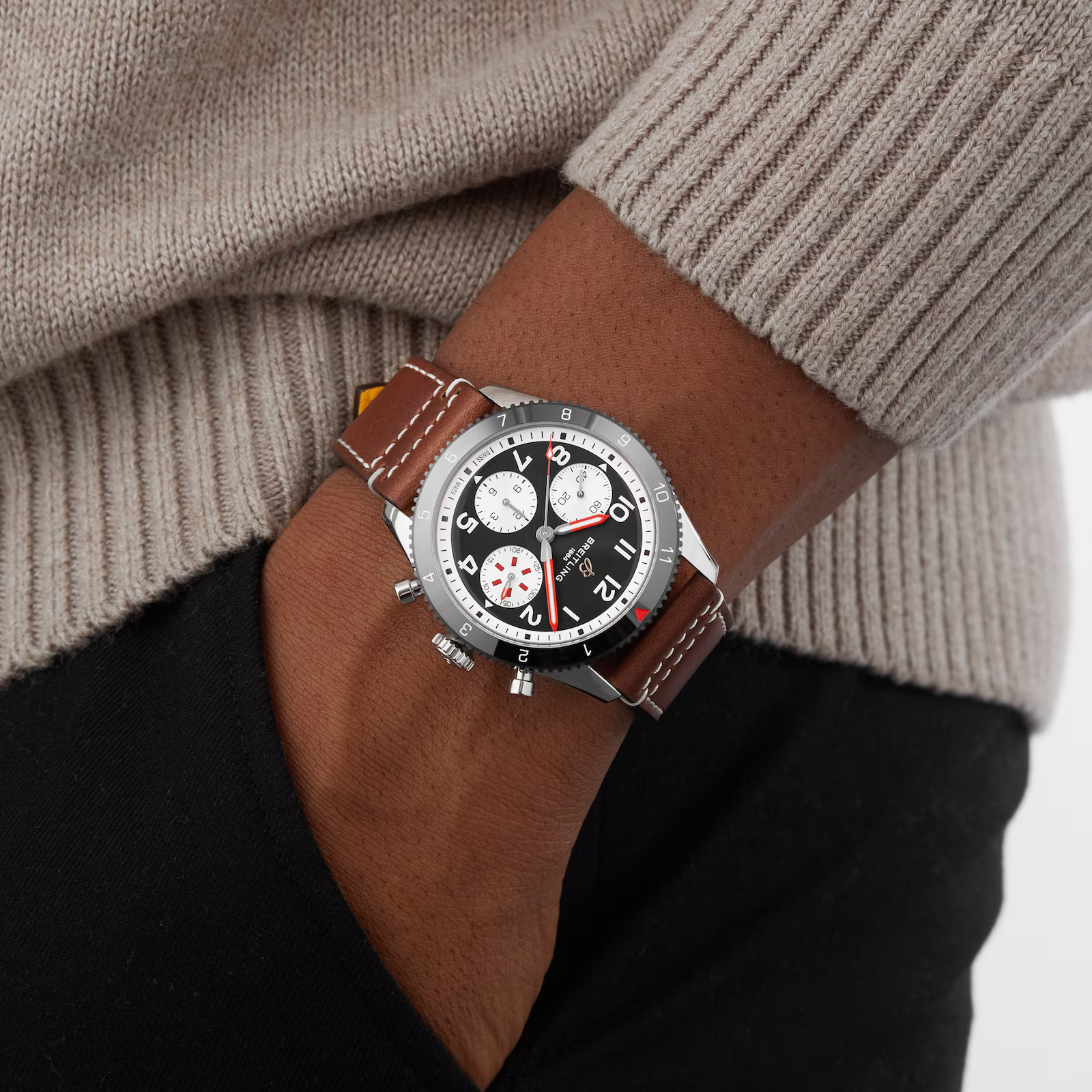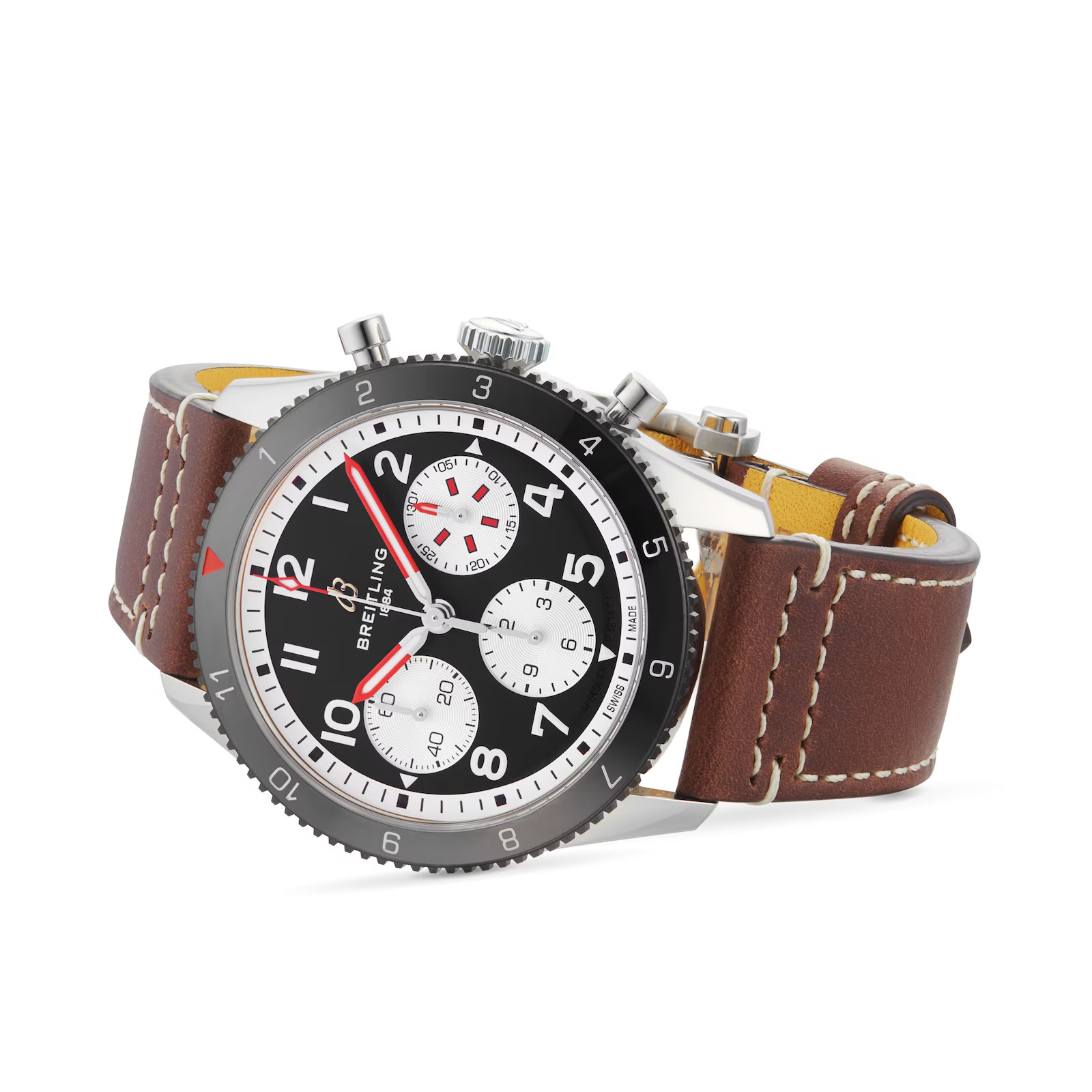 The knurled bezel on the 42mm case provides optimal grip, even in a pilot’s gloved hands. Top-stitched calfskin straps give a nod to the seams found on classic flight gear. Pilots and other travelers will appreciate its legibility, wearability, and understated style. The engine of the Classic AVI is the C0SC-certified Breitling Caliber 23 movement, which provides approximately 48-hours power reserve.