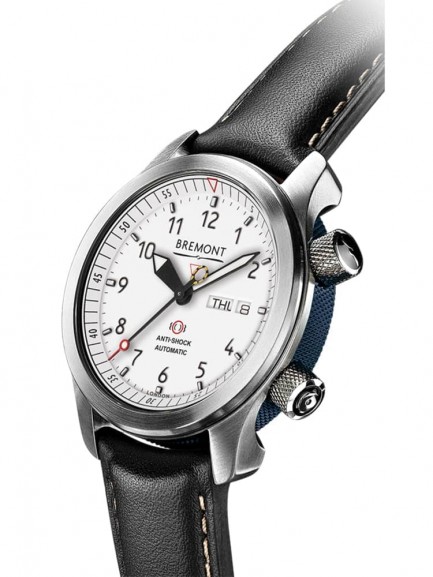 Add a sense of style to your outfit with this luxury mens watch from Bremont. Crafted from a hardened stainless steel case which is sure to protect the automatic chronometer movement even in intense situations. The clean white dial comes with large luminescent hands, black Arabic numeral hour markers and a functioning date window as well as the second’s hand which depicts the pull handle of an aircrafts ejector seat.