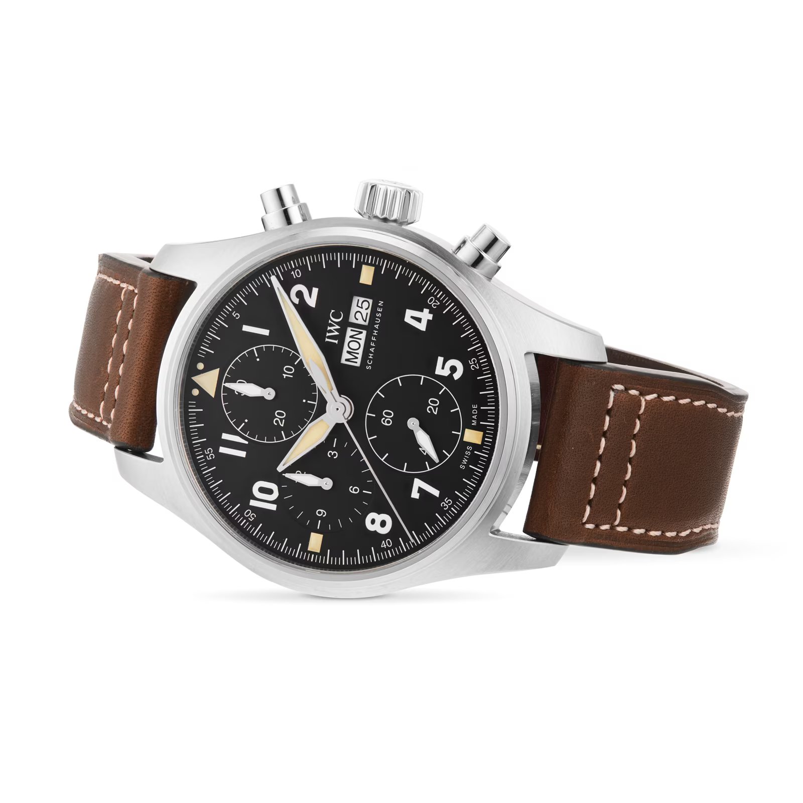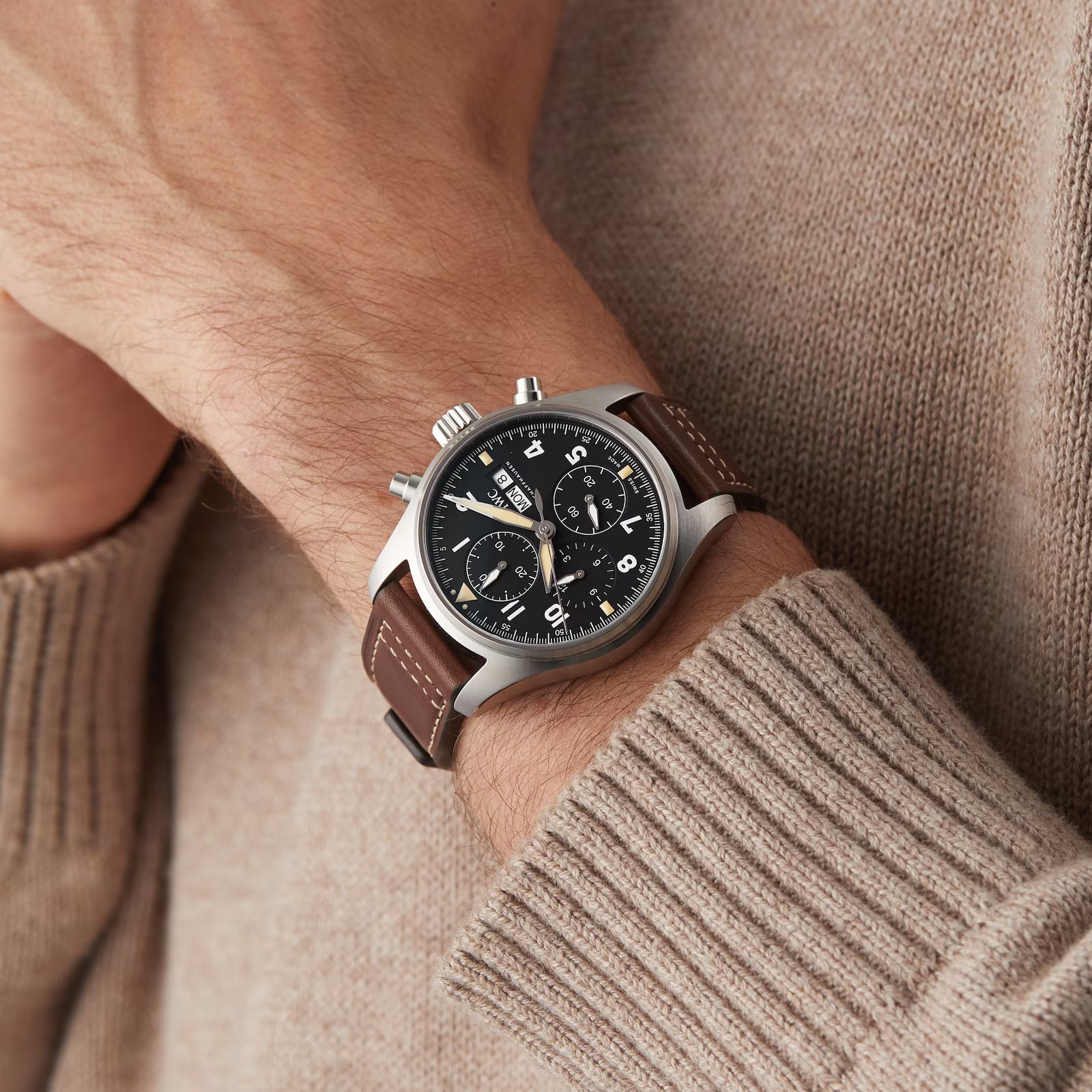 For the first time ever, IWC presents a Pilot’s Chronograph with a movement from the 69000-calibre family, housed in a reduced case size with a diameter of 41 millimetres. The IWC-manufactured 69380 calibre is a rugged chronograph movement with a classic column wheel design. It displays stopped hours and minutes in two subdials at “9 o’clock” and “12 o’clock”. The bidirectional pawl-winding system builds up a power reserve of 46 hours. With a stainless-steel case, black dial and brown calfskin strap, the colours of this functional chronograph were inspired by the Spitfire’s cockpit. A soft-iron inner case effectively shields the movement from magnetic fields.