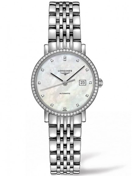 A stylishly crafted ladies timepiece from Longines which consists of a light mother of pearl dial, complete with slim fitting silver hands and small diamond hour markers as well as a date window. Fastens securely using a stainless steel bracelet.