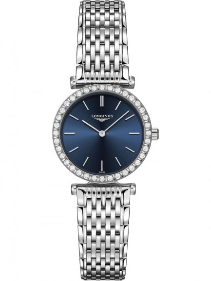 This La Grande Classique de Longines watch features 36 diamonds totalling 0.302 carats set around the bezel. Scratch resistant sapphire crystal houses the blue dial, which consists of roman numerals and a pair of silver quartz powered dial hands. A triple safety folding clasp with push button provides a safe and secure fastening.