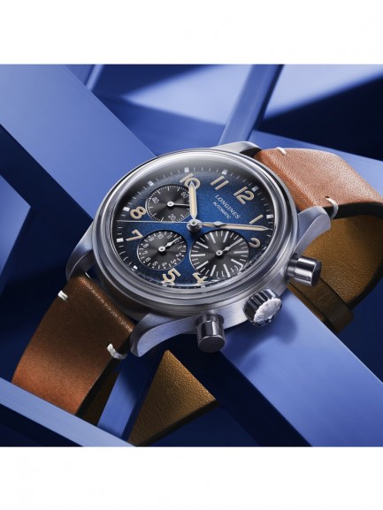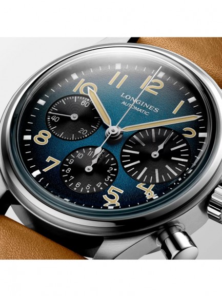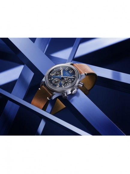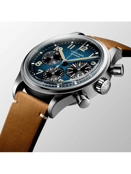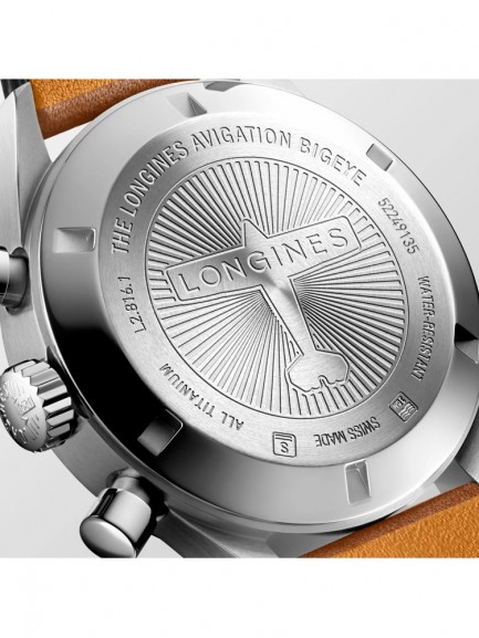 The Longines L2.816.1.93.2 Avigation BigEye watch from the Heritage collection combines a 41mm round shaped titanium case and brown leather strap with a buckle clasp. It has a blue petroleum coloured analogue dial with Swiss Super-LumiNova coated hands and black chronograph sub-dials, all of which is protected beneath scratch resistant sapphire crystal glass with several layers of anti-reflective coating on the underside. Power is generated by the L688 automatic movement with a power reserve of approximately 66 hours. This model also has a water resistance of up to 30 metres and a 5 year warranty.