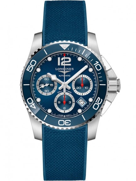 Longines HydroConquest collection introduces this watch featuring a stainless steel case and blue rubber strap. Surrounding the scratch resistant anti-reflective coated sapphire crystal is a blue bezel matching the blue dial. Chronograph sub dials, date display and Superluminova coated dial hands are all powered by an automatic movement. Accents of red on the dial hands complete the look.