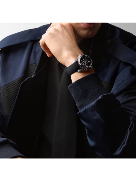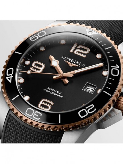 The Longines L3.781.3.58.9 HydroConquest watch combines a 41mm round shaped stainless steel case and black rubber strap with a push button clasp. It has a black analogue dial with a date display and Super-Luminova coated hands which are protected beneath scratch resistant sapphire crystal glass with several layers of anti-reflective coatings applied to both sides. Power is generated by the Calibre L888 automatic movement with a power reserve of approximately 72 hours. This model also has a lug distance of 21mm, a unidirectional rotating ceramic bezel, and a water resistance of up to 300 metres.