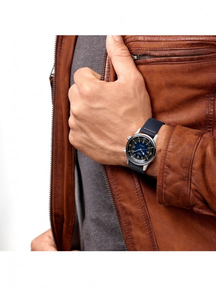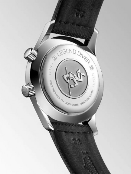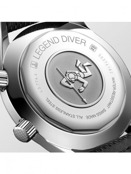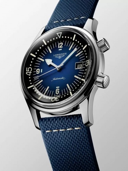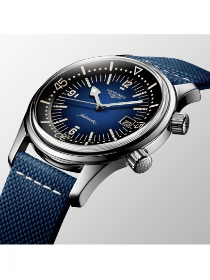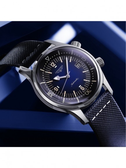 The Longines L3.774.4.90.2 Legend Diver watch from the Heritage collection combines a 42mm round shaped stainless steel case and blue fabric strap with a traditional buckle. It has a blue fade effect analogue dial with a date display and Swiss Super-LumiNova coated hands all of which is protected beneath scratch resistant sapphire crystal glass with several layers of anti-reflective coating on the underside. Power is generated by the L888 automatic movement with a power reserve of approximately 72 hours. This model also has a water resistance of up to 300 metres.