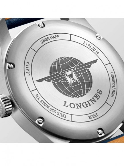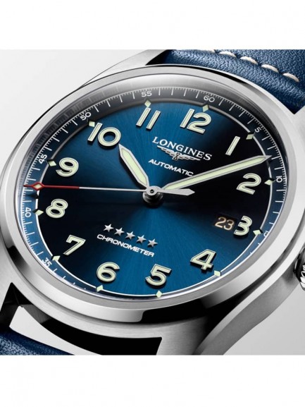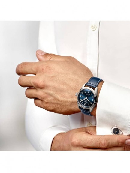 From the Longines Sport series is the Spirit collection. This edition has a 42mm stainless steel case and blue leather strap with a buckle clasp. The blue dial has Superluminova coated dial hands powered by the L888.4 Caliber automatic Chronometer movement, a COSC certified movement with a 64 hour power reserve and monocrystalline silicon balance-spring.