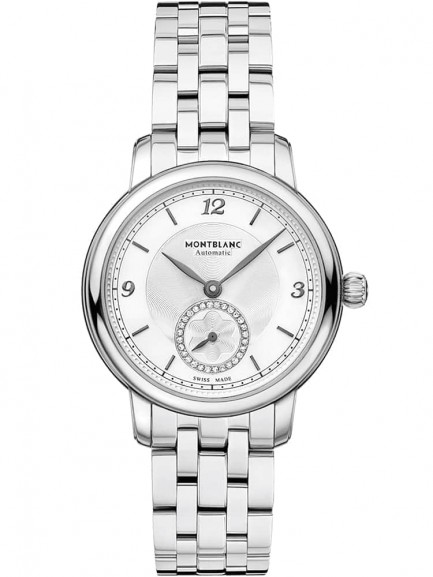 This Montblanc ladies watch is inspired by the Minerva heritage that dates back to 1858, and consists of a stainless steel case and bracelet housing a diamond set dial. Protected beneath the anti-reflective coated sapphire crystal glass dome is a silver tone dial with anthracite indexes and small-seconds counter powered by an automatic movement.