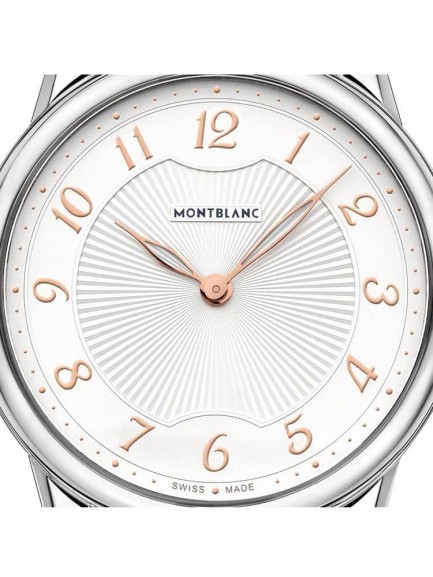 This smart and stylish Boheme quartz watch comes as standard with Montblancs scratch-resistant sapphire crystal glass and alligator skin strap. The 123867 model in particular features full Arabic numeral hour indices and open marquise hands in rose gold, and silver sunburst detailing to the inner dial.