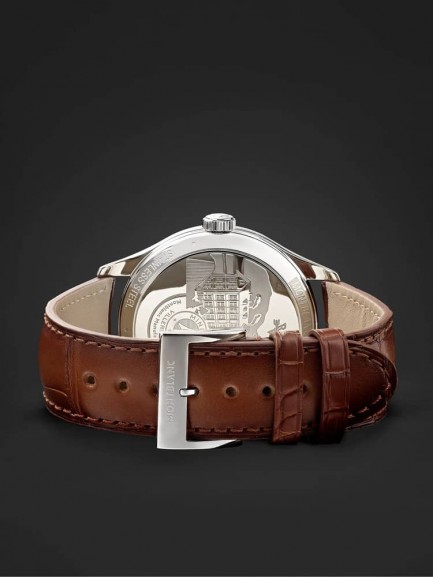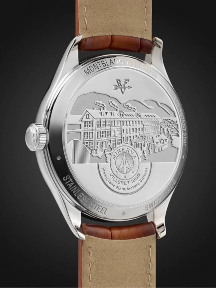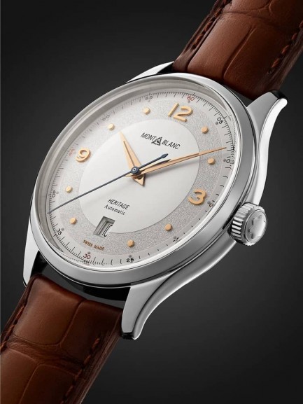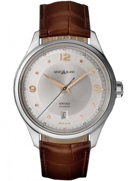 The Montblanc 128672 Heritage watch is inspired by historical Minerva classic wristwatches from the 1940s and 1950s and combines a 40mm round shaped stainless steel case and brown leather strap with a traditional buckle. It has a silvery white analogue dial with a date display and rose gold Arabic numerals and indexes which is protected beneath domed scratch resistant sapphire crystal glass with an anti-reflective coating. Power is generated by the Calibre MB 24.17 automatic movement with 25 jewels and a power reserve of up to 38 hours. This model also has a water resistance of up to 50 metres.