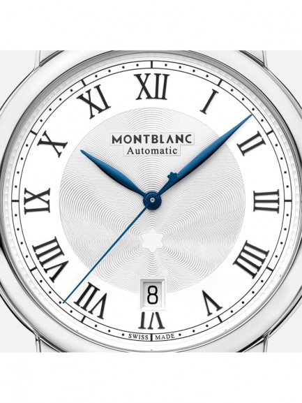 The Montblanc 124341 Star Legacy watch takes its inspiration from Minerva’s heritage and the company’s pocket watches that were made during the late 19th century and early 20th century. It combines a 39mm round shaped stainless steel case and blue leather strap with a traditional buckle. It has a white analogue dial with blue hands and a date display which is protected beneath domed scratch resistant sapphire crystal glass. Power is generated by the Calibre MB 24.09 automatic movement with 25 jewels and a power reserve of up to 42 hours. This model also has a sapphire crystal case back and a water resistance of up to 30 metres.