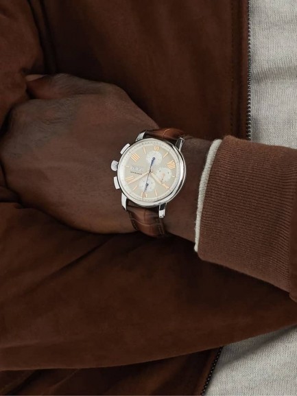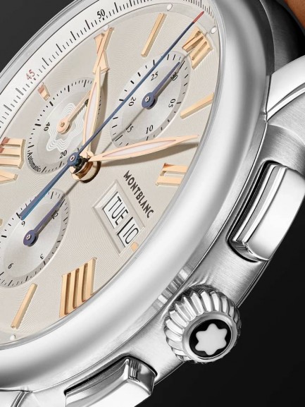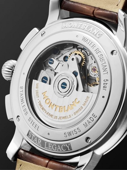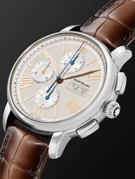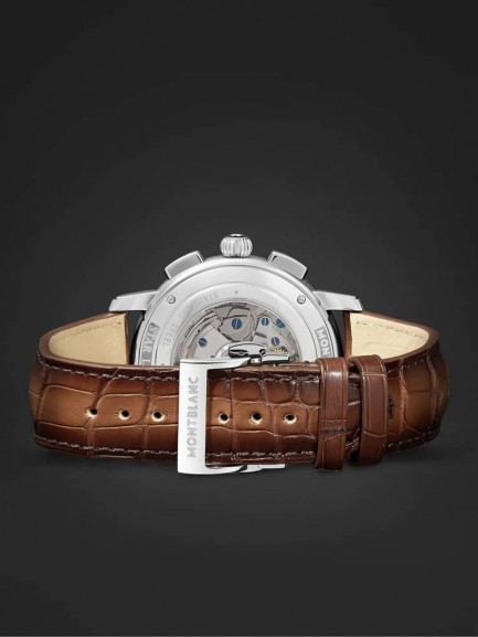 The Montblanc 126080 Star Legacy watch takes its inspiration from Minerva’s heritage and the company’s pocket watches that were made during the late 19th century and early 20th century. It combines a 43mm round shaped stainless steel case and brown alligator leather strap with a traditional buckle. It has a cream analogue dial with 18k rose gold luminescent hands, a day/date display, and chronograph sub-dials, all of which is protected beneath scratch resistant sapphire crystal glass. Power is generated by the Calibre MB 25.07 automatic movement with 25 jewels and a power reserve of up to 48 hours. This model also has a sapphire crystal case back and a water resistance of up to 50 metres.