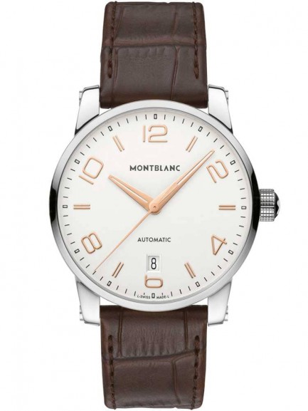 The Montblanc Timewalker range encompasses traditional Swiss watchmaking excellence and dynamic 21st century styling, creating this prestigious timepiece. The handsome design is crafted from polished stainless steel, scratch resistant sapphire crystal glass and a quality Swiss automatic movement. The round contemporary dial features a flawless white finish with modern numerals, date window and suave rose gold tone detailing. Complete with textured brand logo crown and a luxurious brown leather strap with traditional buckle fastening for a secure and comfortable fit.