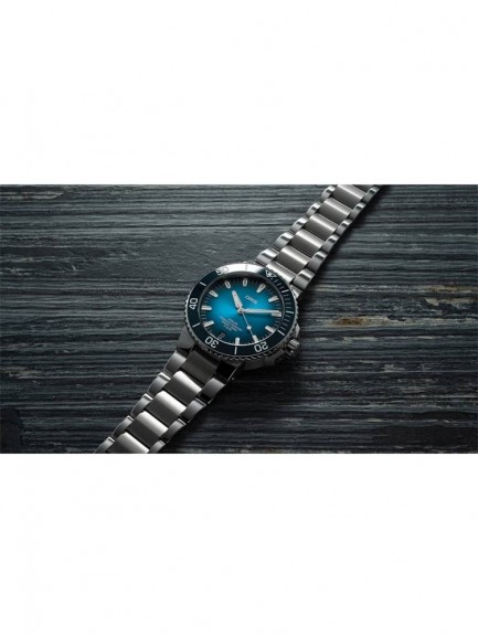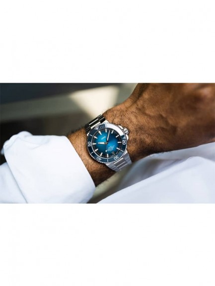 The Oris Aquis Date Calibre 400 combines a 43.5mm stainless steel case and bracelet with a blue dial. Powering the Superluminova coated hands is the automatic movement with a 120 hour power reserve and 21 jewels. This movement uses more than 30 anti-magnetic components and any watch using the Calibre 400 movement is also guaranteed for 10 years when you register it at MyOris.