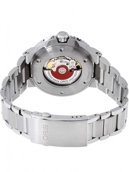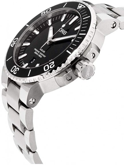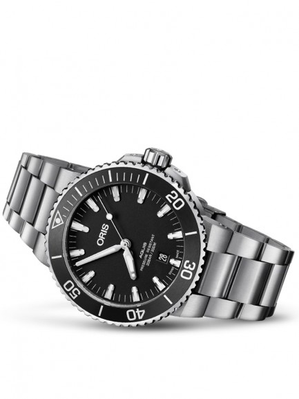 Oris introduces this latest addition to the Aquis series. Crafted from stainless steel, the piece features a sturdy and durable link bracelet equipped with a push button deployment clasp, as well as a black ceramic bezel hosting a 60 minute scale. Protecting the dial is a domed sapphire crystal with anti-reflective coating applied inside, improving legibility during bright light. The black dial is decorated with silver tone hour batons and dial hands which possess Superluminova coating, allowing the watch to be used even during low light. Alongside a useful date display, the piece is capable of resisting up to 300 metres of water, demonstrating the ingenuity seen throughout the Aquis series. At the heart of this timepiece is a complex automatic movement with a power reserve of up to 38 hours, which can be observed and admired via the transparent mineral crystal case back.