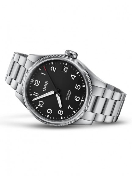 The Oris 01 751 7761 4164-07 8 20 08 Big Crown ProPilot watch combines a 41mm round shaped stainless steel case and bracelet with a fold over clasp. It has a black analogue dial with Superluminova coated hands and numerals and a date display, all of which is protected beneath domed scratch resistant sapphire crystal glass with an anti-reflective coating inside. Power is generated by the Oris 751 automatic movement with 26 jewels and a power reserve of up to 38 hours. This model also has a transparent mineral crystal case back, a screw-in security crown, and a water resistance of up to 100 metres.