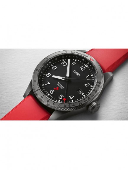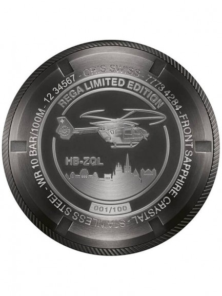 The Oris 01 798 7773 4284 HB-ZQL-SET Big Crown ProPilot Rega Fleet watch is limited to just 100 pieces worldwide and combines a 41.5mm round shaped stainless steel case and black leather strap with red lining and a fold over clasp. It has a black analogue dial with Superluminova coated hands and numerals and a date display, all of which is protected beneath domed scratch resistant sapphire crystal glass with an anti-reflective coating inside. Power is generated by the Oris 798 automatic movement with 25 jewels and a power reserve of up to 42 hours. This model comes with a certificate and has an additional red leather strap, a screw-in security crown, a water resistance of up to 100 metres, and an individually numbered case back engraved with an Airbus Rega rescue helicopter H145 and the registration HB-ZQL.