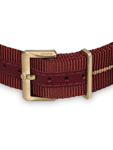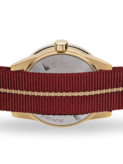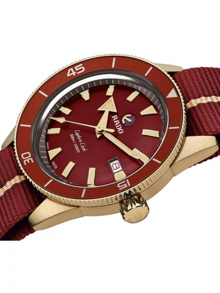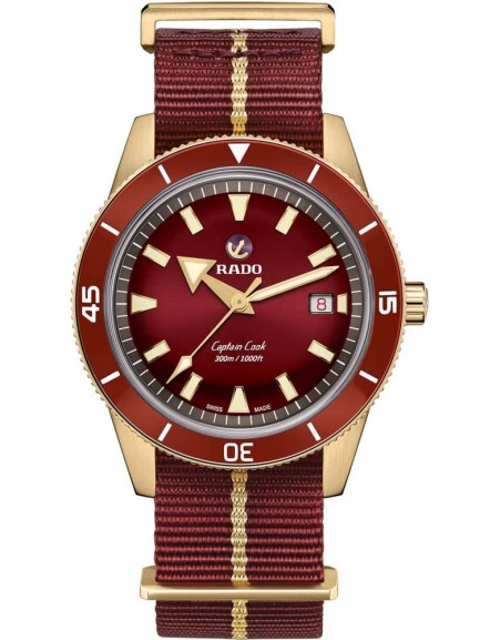 The Rado R32504407 Captain Cook watch is a reimagined watch from 1962 and improved for the modern day. It combines a 42mm round shaped bronze and high-tech ceramic case with a red fabric NATO strap and traditional buckle. The red analogue dial has luminescent hands and a date display and is protected beneath scratch resistant sapphire crystal glass with an anti-reflective coating. Power is generated by the Rado Calibre R734 automatic movement with an anti-magnetic Nivachron hairspring and power reserve of up to 80 hours. This model also has a water resistance of up to 300 metres.