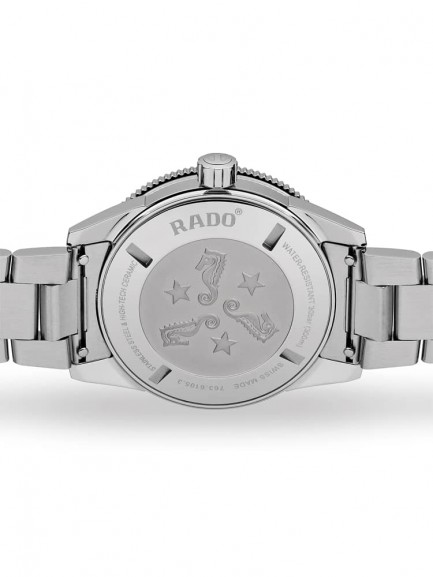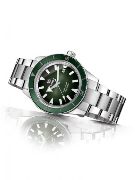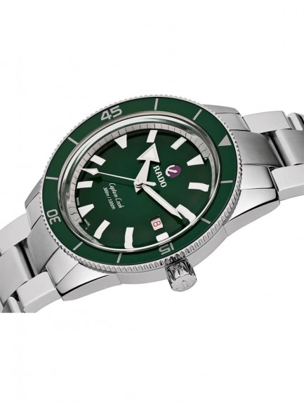 A Rado Captain Cook series watch combining a 42mm stainless steel case and bracelet with a push button clasp. It has a green dial and bezel and is powered by an automatic movement with an 80 hour power reserve. The watch also weighs 165 grams.