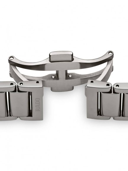 The award winning True series from Rado features sleek contemporary designs. This example has a 30mm plasma high-tech grey ceramic case and bracelet and closes with a push button clasp. Sapphire crystal protects the dial, which is composed of a grey backdrop with luminescent rose dial hands, diamond hour markers, and a date display, all powered by a quartz movement.