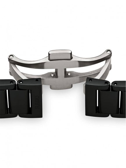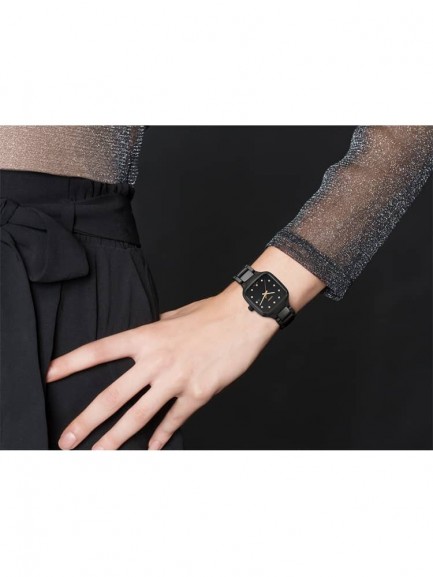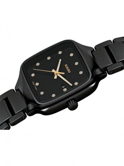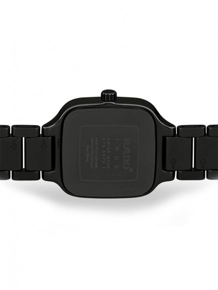 The Rado R27080702 True Square watch combines a 29mm square shaped black high-tech ceramic case and black ceramic bracelet with a double push button clasp. The ceramic used for this watch is lightweight and also scratch resistant. It has a black analogue dial with rose gold tone luminescent hands, a date display, and 12 diamond hour markers totalling 0.096 carat, all of which is protected beneath scratch resistant sapphire crystal glass. Power is generated by the quartz movement. This model also has a water resistance of up to 50 metres and weighs 67 grams.