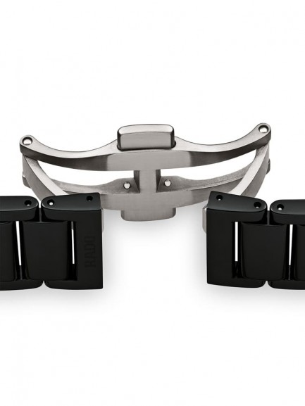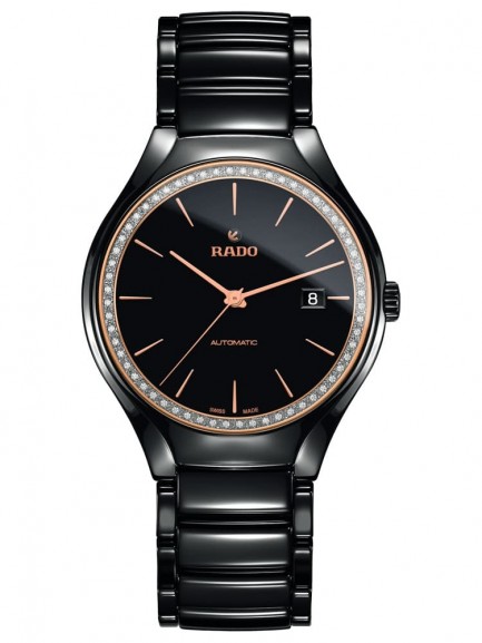 Add a touch of sophistication to your outfit with this black mens timepiece from Rado. The round dial consists of slim rose-tone hands and hour markers along with a subtle date window, powered by the automatic movement, and surrounded by a diamond-embedded bezel. Fastens securely using a scratch-resistant ceramic bracelet.
