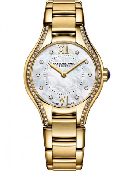 Raymond Weil present this stylish watch with a gold plated stainless steel bracelet combined with a beautiful mother of pearl dial. The watch also features diamonds and Roman numerals as alternative to numbers.