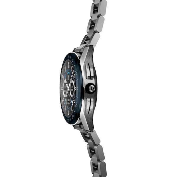 Guided by the taste and polishes of their classic timepieces, TAG have pushed the limits of design and technology to create a new generation of connected watches. This timepiece features the faceted horns, scratch-resistant sapphire crystal and ceramic blue bezel that has become signature to the brands watchmaking style.