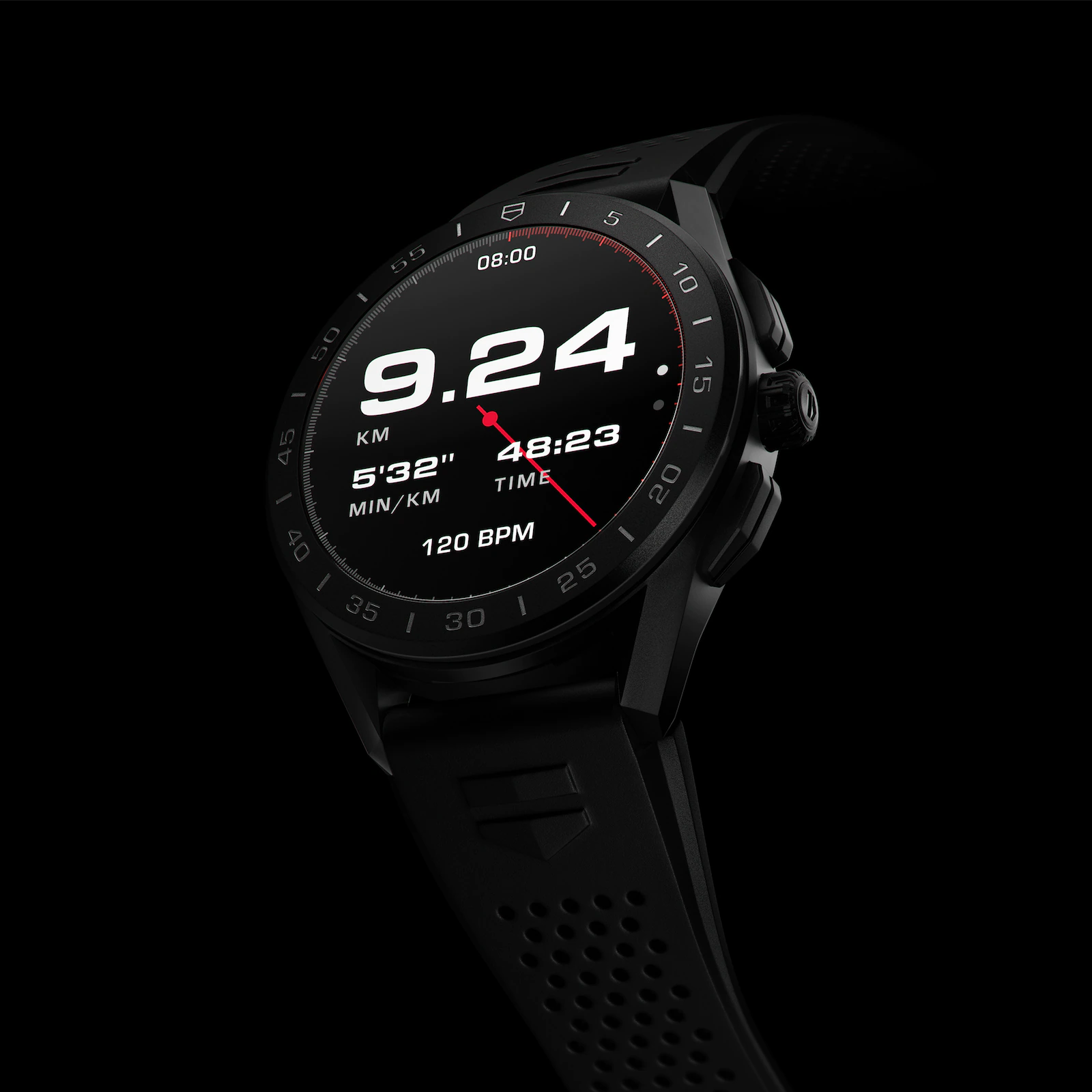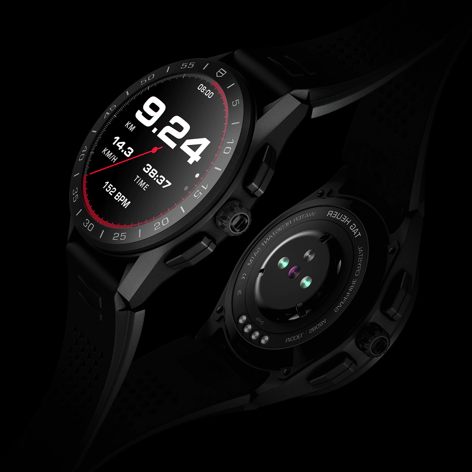 This TAG Heuer Connected offers a total-black look as well as an ultra-light titanium case. Designed with the most advanced materials: Grade 2 titanium DLC case, micro-blasted ceramic bezel, steel crown and buttons. The rubber strap is closed by a black clasp. Perfect for athletes, the TAG Heuer Connected is at the service of your best performance.