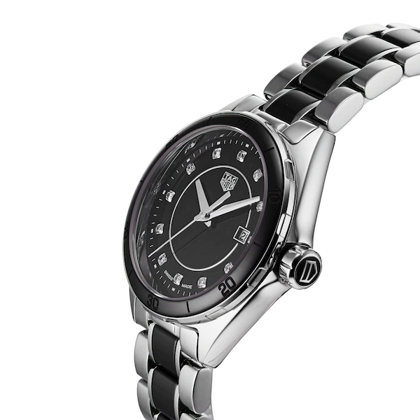 The perfect ladies watch for today’s powerful women, this TAG Heuer Formula 1 beautifully combines both a sporty and elegant aesthetic with an unbeatable Swiss quartz movement. Described by TAG Heuer as the perfect marriage of fashion and functionality, this stunning TAG Heuer ladies watch makes use of precious materials like stainless steel and ceramic to create an unmissable finish on the wrist while also housing a quartz calibre considered one of the most reliable and accurate made in Switzerland. Instantly noticeable, the striking black dial of this TAG Heuer Formula 1 Ladies watch is decorated with the brand’s famous logo at 12 o clock, faceted indexes and sleek steel hands. The neatly sized 32mm fine brushed and polished stainless steel case is water resistant to 100 metres and moulds elegantly to the wrist thanks to the sleek lugs and sophisticated two toned black ceramic and stainless steel bracelet. Hidden within is a Swiss made quartz movement which equips the timepiece with hour, minute and seconds function, a handy date window at 3 o clock and a special End-Of-Life battery indicator feature. This TAG Heuer Formula 1 watch for women is another fine example of the brand’s ability to embody glamour and functionality within a timepiece designed specifically for ladies always on the move.