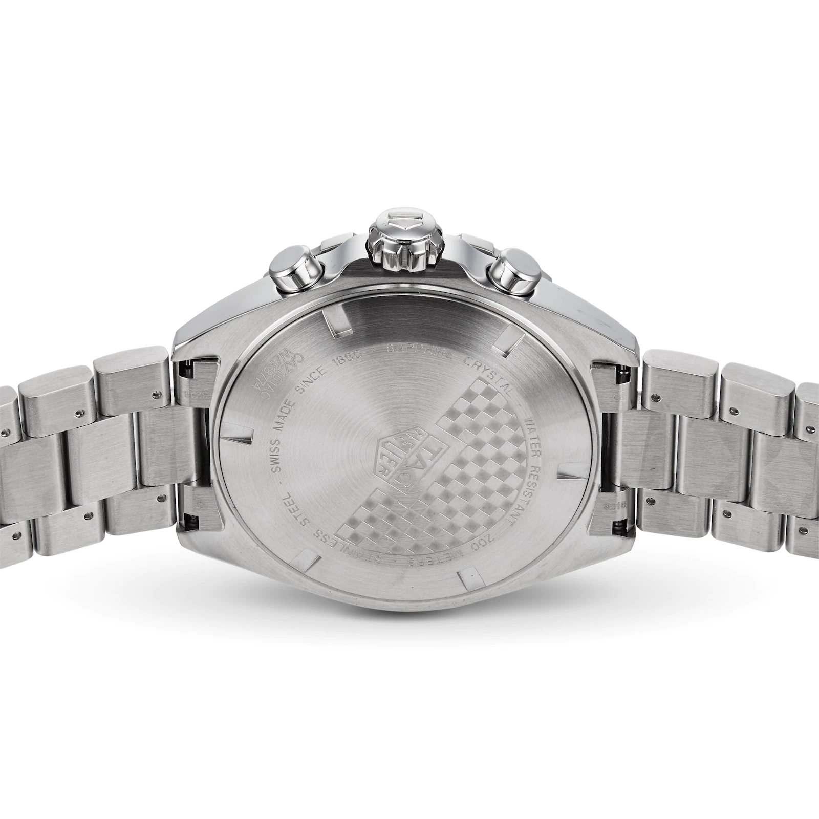 Designed to outpace and outlast, this racer’s timepiece is equipped with steel screw-down crown and case back, and water resistance to 200 meters.