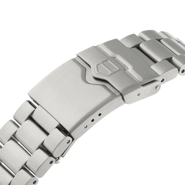 The steel bracelet has a double safety folding clasp to prevent accidental opening and a “Driver” extension for wearing over a racing suit.