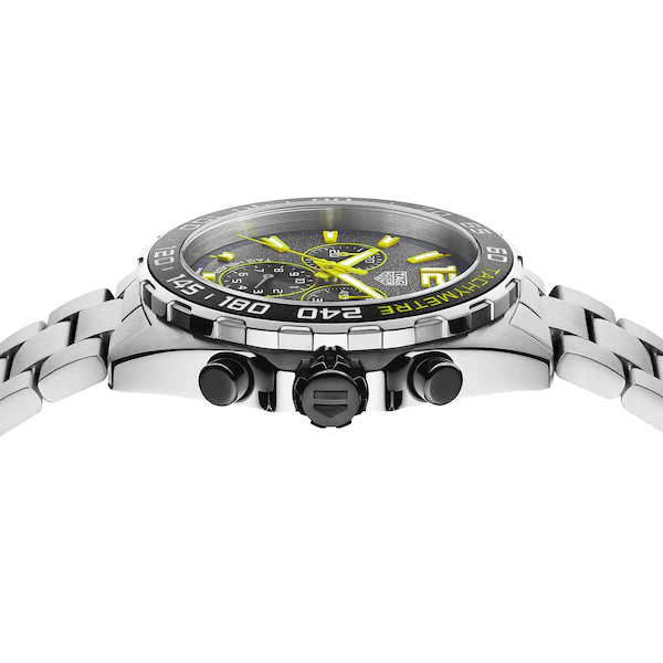 This energetic new TAG Heuer Formula 1 is born to break records. With its grey textured dial matched with bold lime yellow accents, its functional ceramic black tachymeter bezel and chronograph pushers, this 43mm racing chronograph is sure to turn heads. Enhancing the stimulating dial is a flat sapphire crystal, large Super-LumiNova® filled hands and applied markers, for maximum visibility. A brushed steel bracelet matches the dial, secured by a double safety system with driver extension for brisk wear over a racing suit.