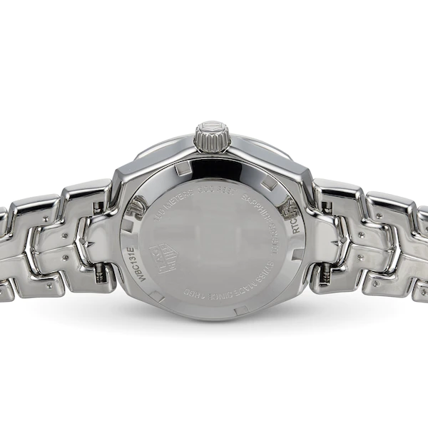 An on-trend Link Lady Quartz with a slender, 32mm steel case. The sunburst grey-brown hues of the taupe dial change shade with each movement of the wrist. Luminous plated rose-gold (5N) details and shimmering diamonds (0.158 CT) on the indexes finish the